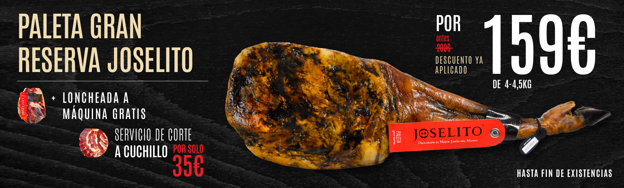 GRATIS SERVICIO DE LONCHEADO A MÁQUINAPaleta de Bellota 100% Ibérica 5 JOTAS. Jabugo (Huelva). 24 meses de curación. Brida Negra. Curación Natural y Artesanal. Certificación 100%. Garantía de Devolución. PRECIO: 46,90 €/Kg ESPECIAL BLACK FRIDAY 2025 PRECIO 37,70 €/KgSERVICIO CORTE A CUCHILLO 35€Pedidos a Cuchillo Entrega 24-48 horas GRATIS SERVICIO DE LONCHEADO A...