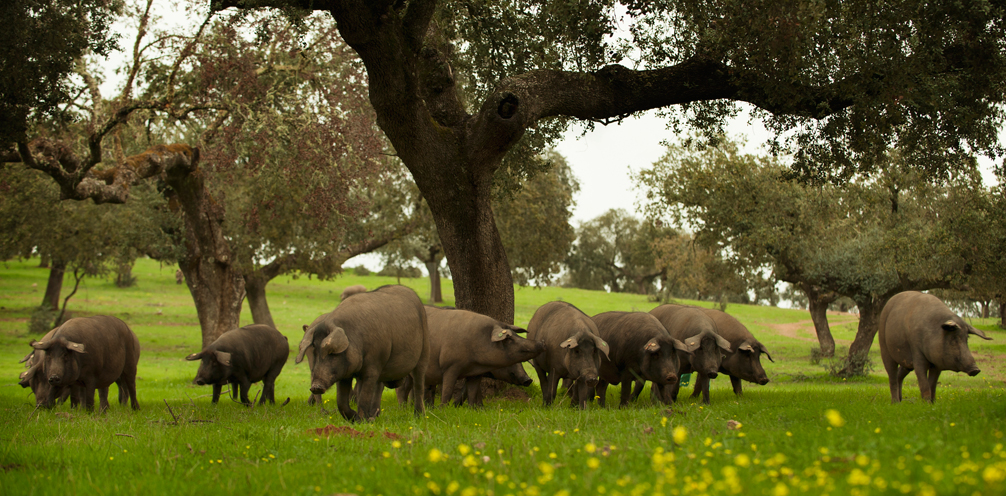 La cría y engorde de los cerdos Ibéricos se lleva a cabo en las dehesas de las provincias de Cáceres y Badajoz que gozan de un magnifico ecosistema con unas dehesas arboladas de encinas y alcornocales donde los cerdos ibéricos gozan de la libertad necesaria para caminar y alimentarse, obteniendo unos Jamones y Paletas de primerísima calidad.