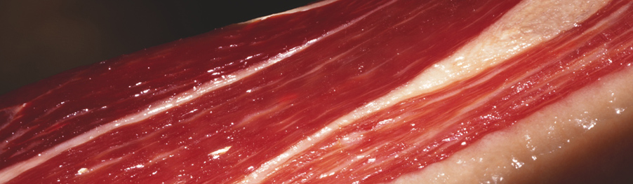 Al corte podemos apreciar la presencia de una grasa muy brillante y fluida dando al Jamón un aspecto muy untuoso y con un veteado característico fruto de la infiltración de la grasa en el músculo.