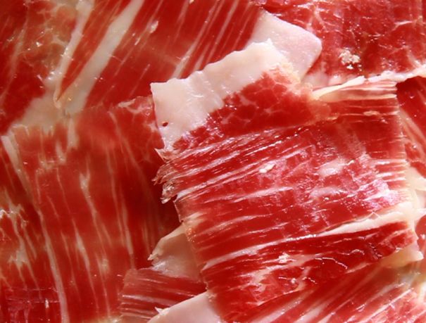 Al realizar el corte apreciamos vetas de grasa entreveradas con la carne magra donde observamos unas motitas blancas que son cristales de tirosina que cristalizan en la masa muscular del jamón debido a la baja concentración de sal utilizada en su elaboración.