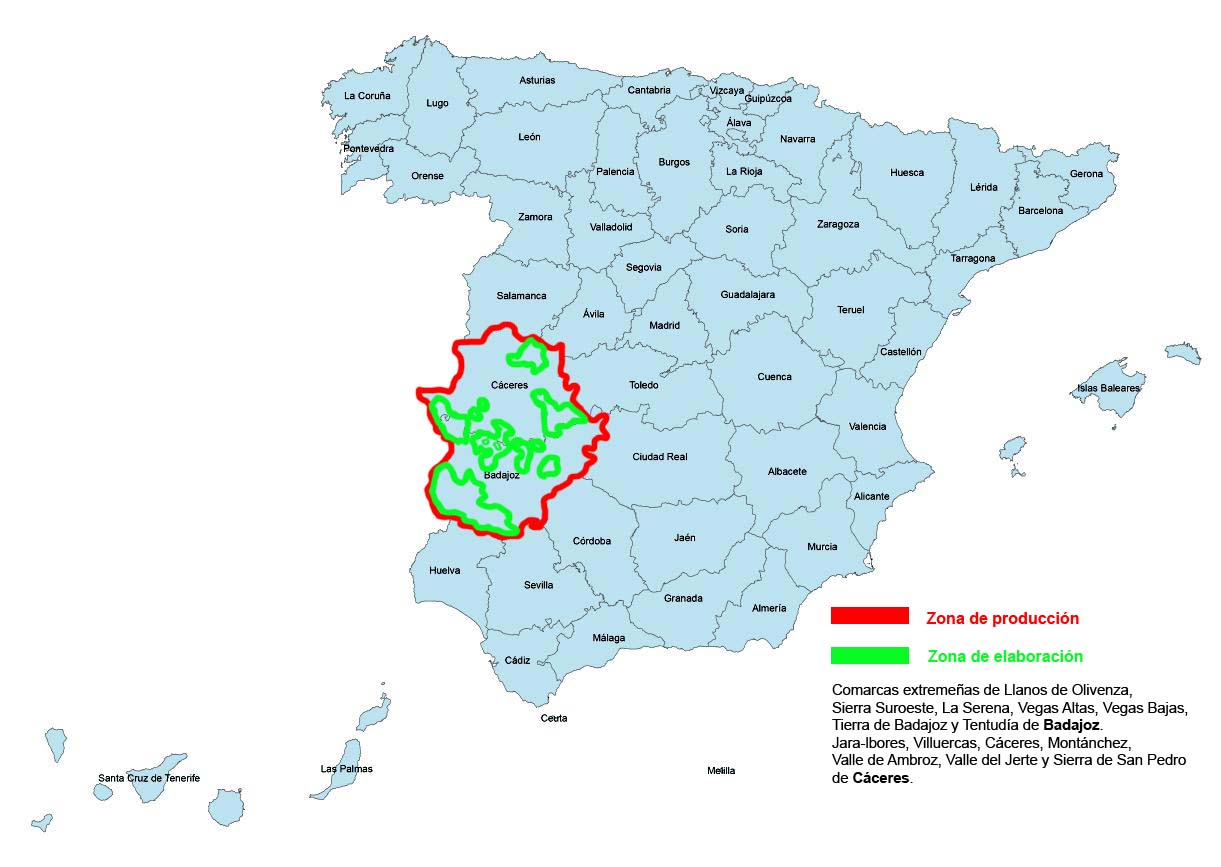 La zona de elaboración de los productos está localizada en la sierra del suroeste de Badajoz, Ibor-Villuercas, Cáceres-Gredos sur, Sierra de Montánchez y Sierra de San Pedro, estando integrada por 45 municipios de Cáceres y 40 municipios de Badajoz.