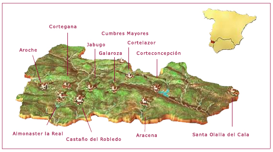 Se delimita la zona de elaboración a 31 municipios de situados entre la Sierra de Aracena y los Picos de Aroche destacando principalmente las localidades de Jabugo, Aracena y Aroche que cuentan con unas condiciones geográficas y climáticas excepcionales que permiten el secado y maduración natural de las piezas dando lugar a unos productos Ibéricos de elevada calidad y reconocimiento a nivel mundial.