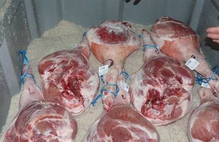 Los cerdos que cumplen con todas las exigencias de la Denominación de Origen Teruel son trasladados a matadero para su sacrificio de manera que una vez sacrificados se realiza el despiece del animal obteniendo sus extremidades y realizando un primer perfilado con corte serrano en V para comenzar con las diferentes etapas de elaboración que comentaremos a continuación: