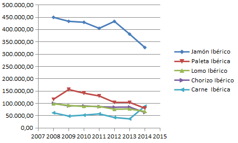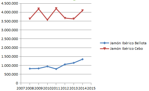El Jamón Ibérico sigue una tendencia de altibajos, con un aumento de comercialización en 2009 pero un retroceso en el 2010 que lo lleva a cifras muy similares del 2008 y a partir del año 2011 una importante vuelta de crecimiento con disminución considerable en 2012 y 2013, para llegar a lograr sus mejores datos de comercialización en el año 2014.