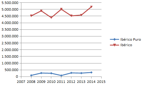 Finalmente, esta tendencia que estamos comentando de altibajos se observa claramente en los datos sumados de comercialización de Jamón Ibérico y Puro Bellota en su totalidad apreciando como 2010, 2012 y 2013 fueron años de retroceso, pero en el año 2014 se produjo un gran repunte mejorando considerablemente las cifras.