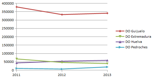 La DO Los Pedroches a pesar del descenso en la comercialización que sufre en 2012 vemos que repunta en el año 2013 duplicando casi los datos obtenidos en el año 2011.