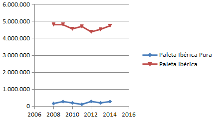 Para ello, expondremos las principales cifras relativas a la producción de Jamón Ibérico y Paleta Ibérica en España para lo que analizaremos el número de piezas comercializadas desde el año 2008 al 2014.