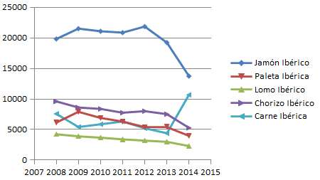También es destacable el descenso en el consumo de Jamón Ibérico y Paleta Ibérica en los hogares españoles si bien es cierto que desde el año 2008 al 2013 se han mantenido cifras muy similares de consumo y ha sido en el año 2014 donde se ha producido una importante disminución.
