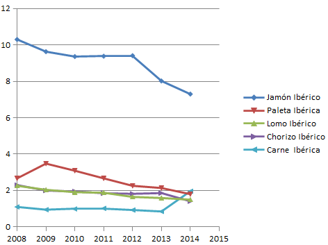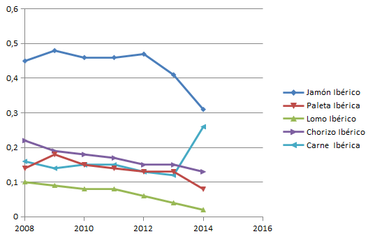 En el caso del Jamón Ibérico y la Paleta Ibérica es a partir del año 2013 donde vemos este descenso más pronunciado mientras que para el Lomo y Chorizo Ibérico la caída ya se empieza a apreciar desde el año 2009.