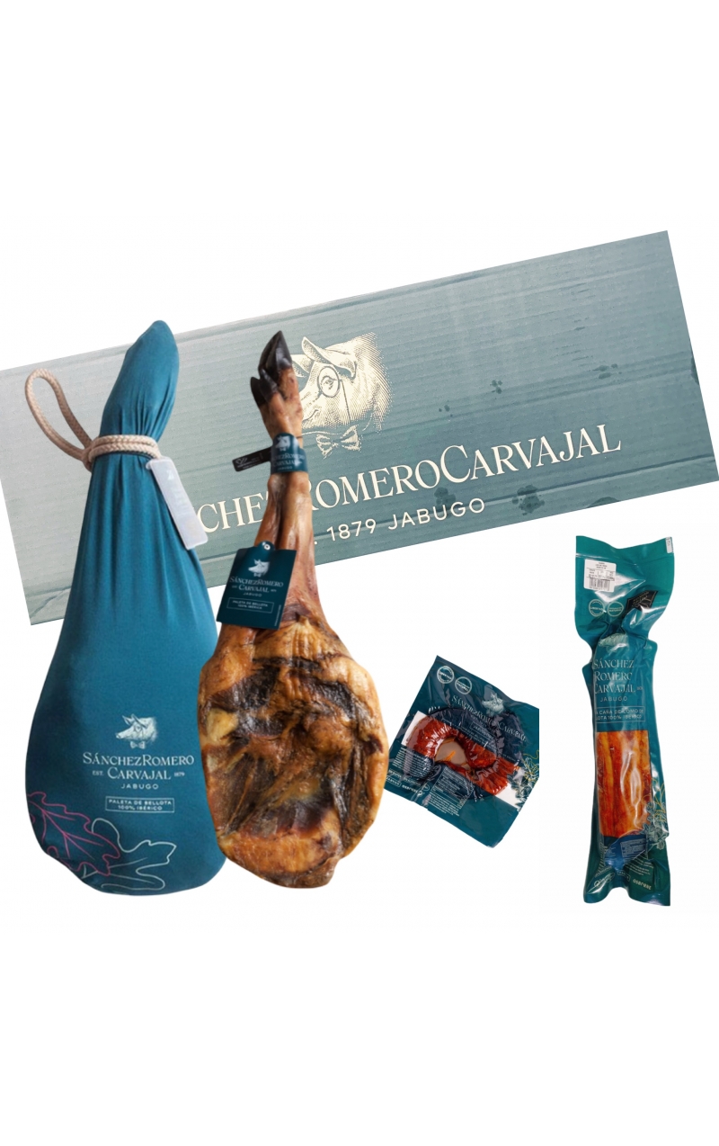 El corazón del lote es la Paleta de Bellota 100% Ibérica Sánchez Romero Carvajal, una pieza reconocida por su sabor profundo y sus matices delicados, resultado de una cuidadosa alimentación con bellotas y un proceso de curación experto. La paleta se complementa a la perfección con el Lomo de Bellota 100% Ibérico Sánchez Romero Carvajal, una joya de la charcutería que destaca por su textura suave y su aroma intenso, y se completa con los deliciosos Jabuguitos, el acompañamiento ideal para un aperitivo inolvidable.
