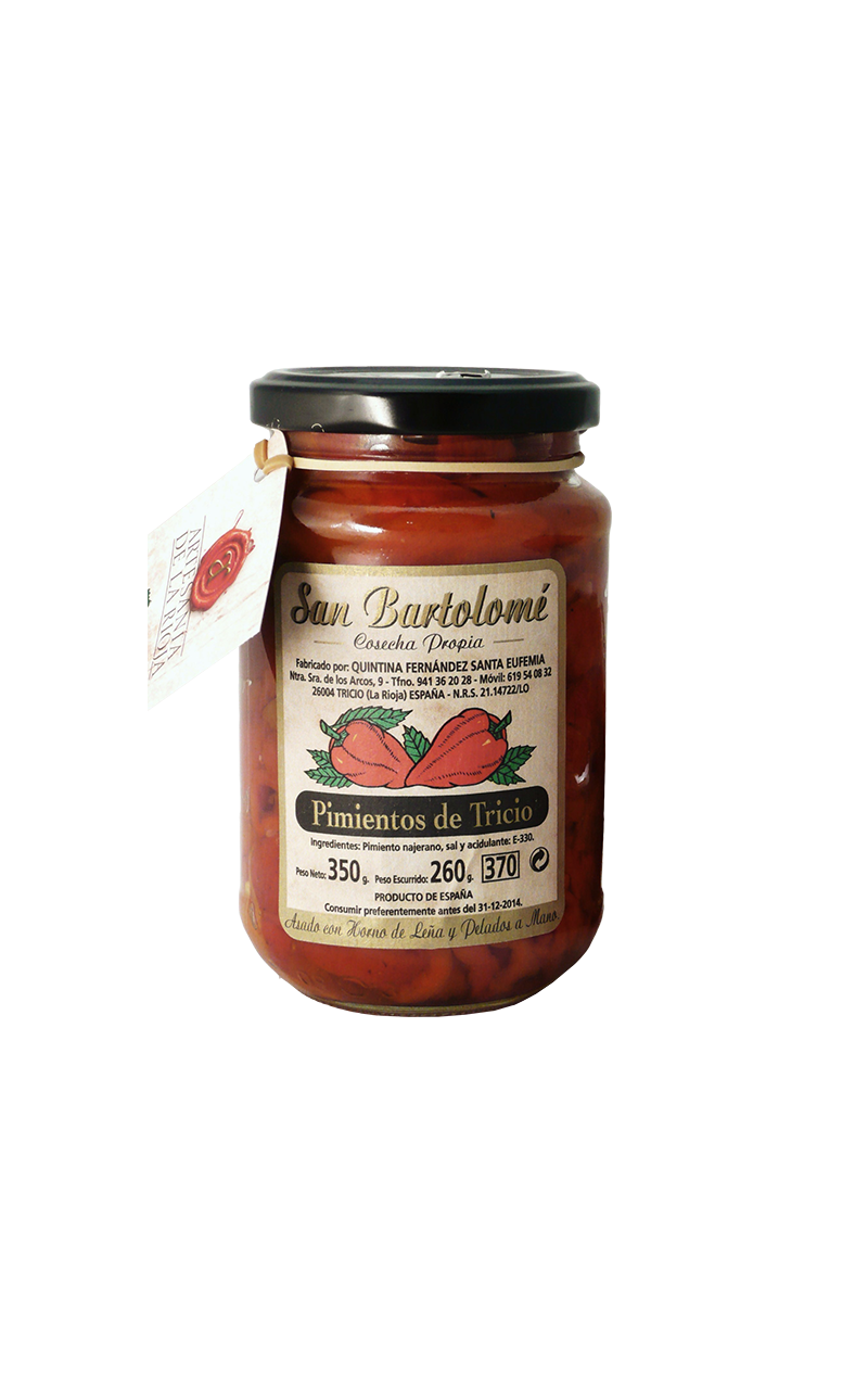 Pimiento Bartolomé en tiras de la variedad najerano acogido a la Indicación Geográfica Protegida, asado con leña y recolectado y seleccionado de su cosecha propia.