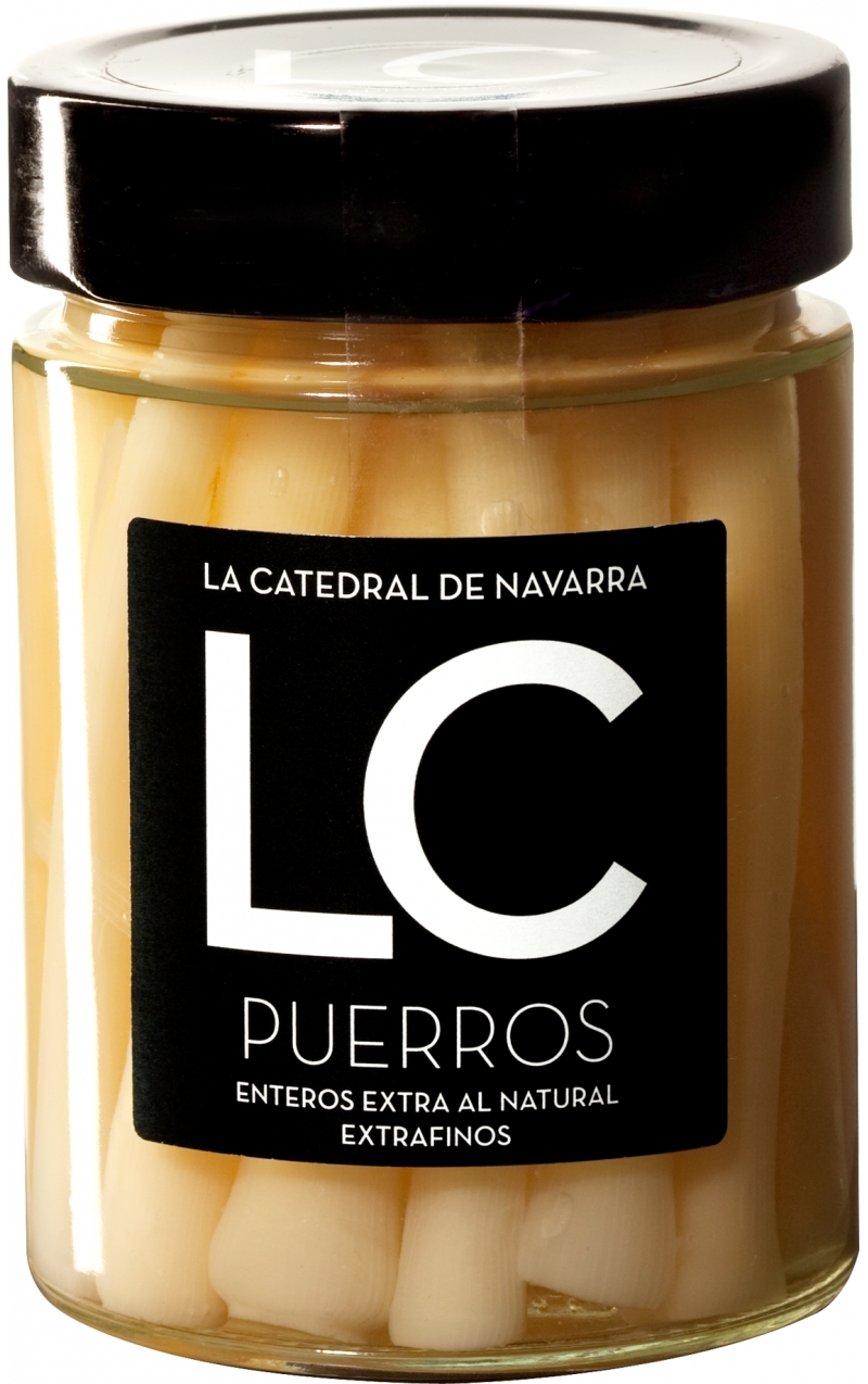 Puerros extrafinos envasados en frasco de cristal y elaborados de forma artesanal que son seleccionados por su grosor muy fino quedándose únicamente con la parte más tierna.