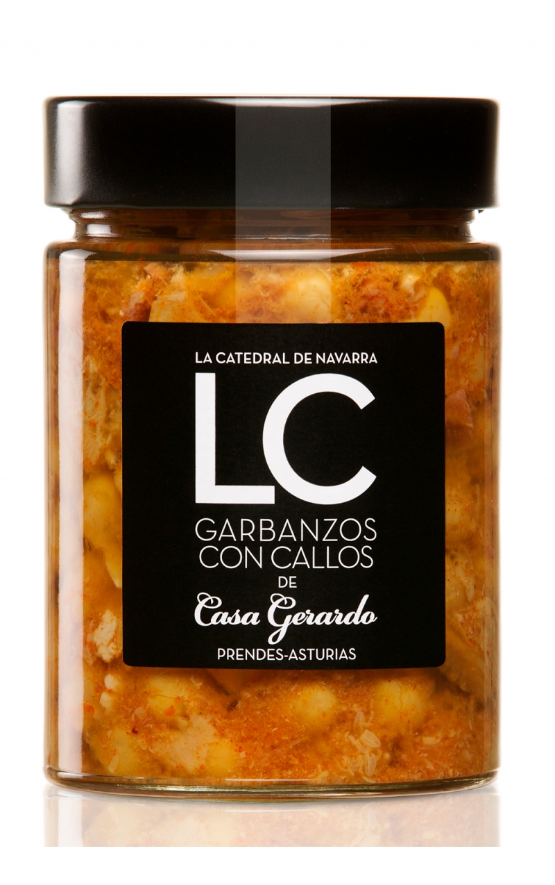 Ceci con la trippa prodotto da La Catedral de Navarra seguendo la ricetta fornita dallo storico Ristorante Casa Gerardo, nelle Asturie, i cui proprietari hanno selezionato i migliori ingredienti e hanno supervisionato il processo di sviluppo, dando come risultato un paio di ceci con trippa deliziosa.