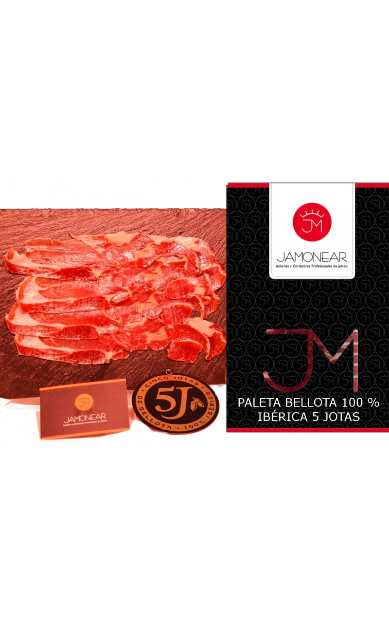 Tavolozza di Bellota 5 Jotas 100% Di origine Iberica Jabugo (Huelva) Loncheada macchina dai nostri professionisti in buste da 100 grammi.
